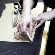 一套凱利易紳正裝,且體師要進行20—30個數據的測量,在做的過程中,還要隨時找到身上的細微變化,以確保數據準確無誤,并留下相關的影像資料備用.然后工藝師核對相關數據,用紙板打出紙樣,進行面料的裁剪。
